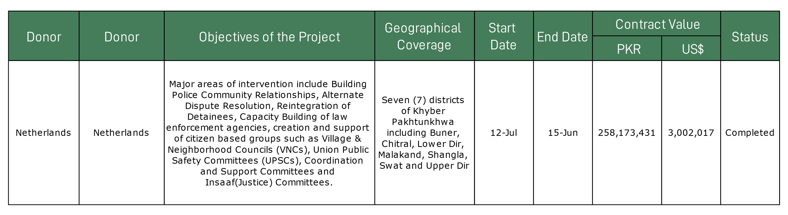 community policing by empowering the local citizenry through participatory activities and creating reciprocally supportive formal linkages with the police. The ADR component is instrumental in channeling issues through existing mechanisms for individual or communal grievances. In addition, the component facilitates the consolidation of role of the criminal justice system covering its full spectrum. Under the rehabilitation of soft detained miscreants, the program provides technical and institutional support to the law enforcement agencies in de-radicalization of negative views and religious perceptions, vocational skill developments and basic livelihood schemes. The design of this component is to ensure that the inmates are provided an opportunity to become part of the progressive civil society and refrain from reverting back to radical/militancy view point.