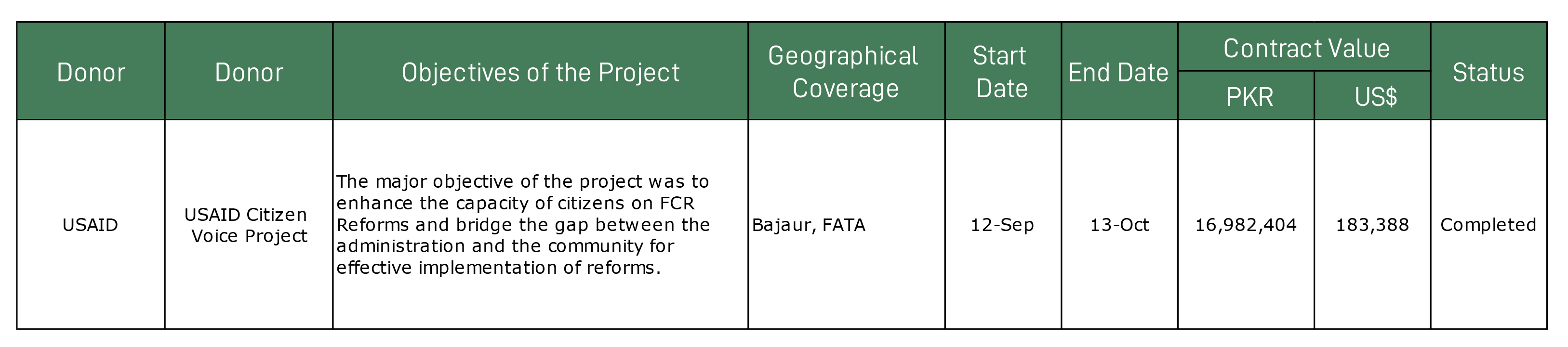Governed under the FCR, a remnant of British Rule framed in 1890 by which it administered the tribal areas through political agents, the tribal areas of FATA are in a dire need of implementation of the reforms in FCR as approved by the President of Pakistan. The legal and political reforms as provisioned in the reforms would optimistically rid the tribal people from a century of bondage and usher them into mainstream of national life while respecting local customs and traditions. The Project aims to carry out advocacy campaign regarding these reforms and involve all stakeholders in the implementation process.